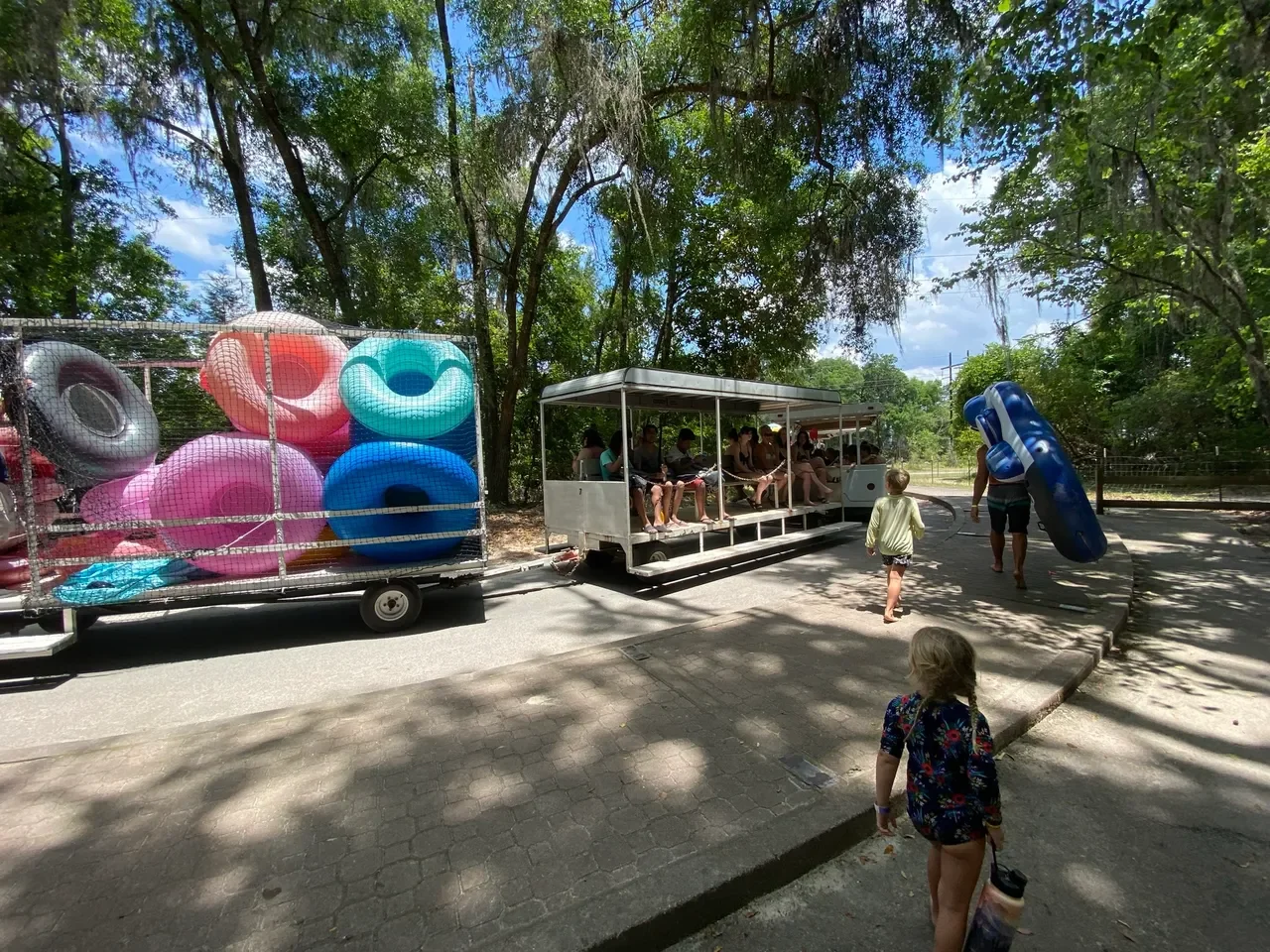 Halfway through the float everyone was still having a blast, so we chose to skip taking out at Dampier’s Landing (45 min – 1hr float time) in favor of continuing on to the last takeout (90 min – 2hr float time).  Another reason we chose to continue floating is that there is no tram service to Dampier’s Landing, so if you take out there, you will have to walk about a quarter mile on a marked path, with your tubes, back to the parking area. No thanks! Longer float, plus a ride back for the kiddos was the way to go.