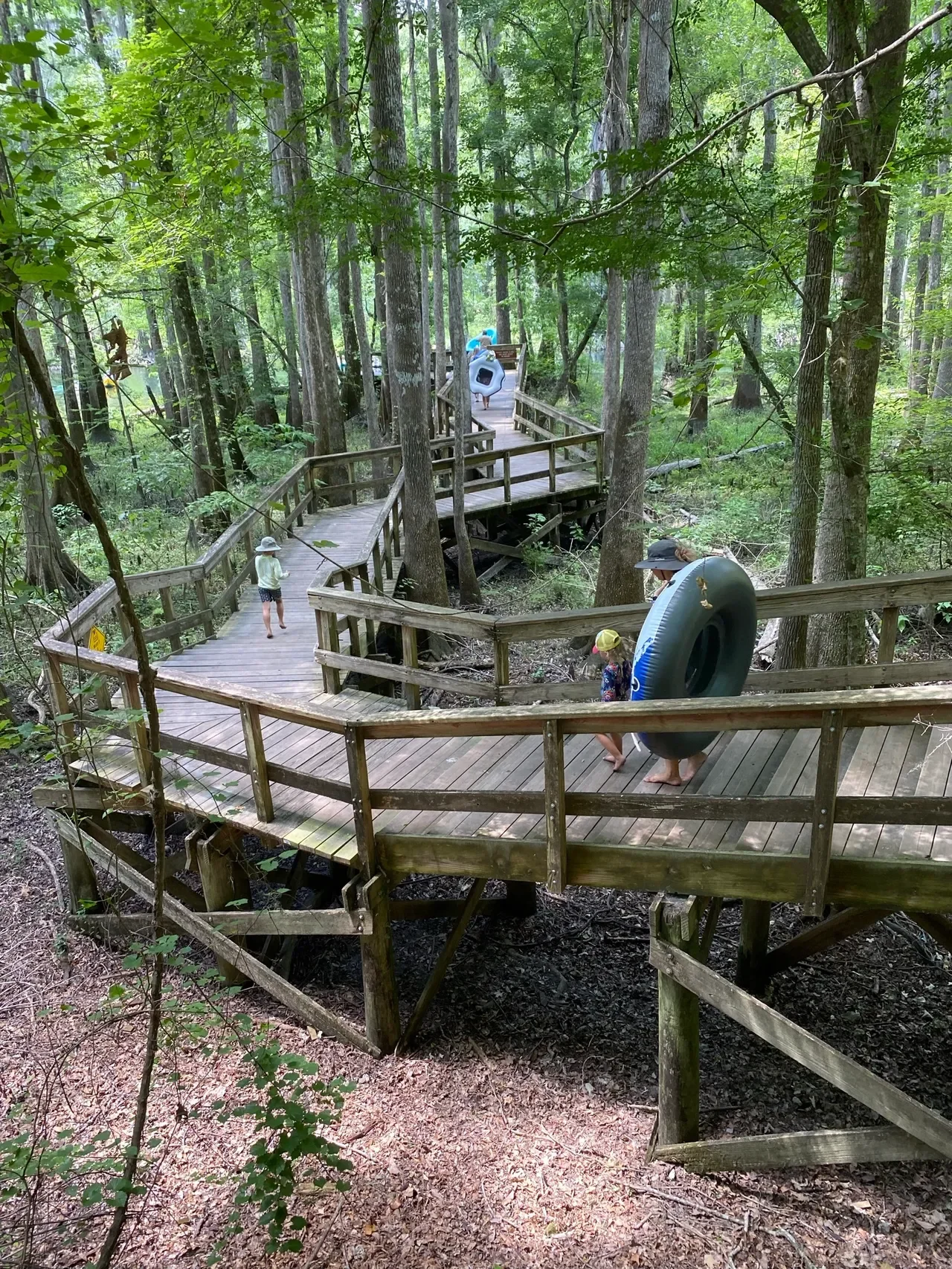 Also located at the North entrance to the state park is a beautiful boardwalk and nature trail to Blue Hole, another nearby spring that flows into the Ichetucknee. Do not pass up the hike to Blue Hole!  We hike out to it every time we visit the park. It is a lovely walk through a simply beautiful, lush, green forest, and it’s pretty rain or shine. We’ve experienced it in both! The boardwalk and wide hard-packed path making the walk a simple, enjoyable one for all ages.