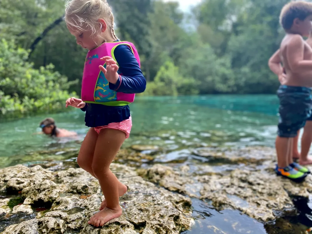 If you are wanting to swim at Ichetucknee Springs instead of tube down the river, make sure you head to the North Entrance of the park. There you will find a beautiful little swimming area at the head spring, along with nice bathrooms, and a few shaded picnic tables. While we enjoyed the swimming area immensely, be aware that there is just a very small beach-type area for the littles, and lots of slippery and jagged rocks in the shallower parts of the spring. It’s not the easiest spring in the area for the younger ones to explore, but it sure is pretty, and definitely worth a visit.  The kids had fun climbing around the rocks and we enjoyed swimming out over the spring boils.