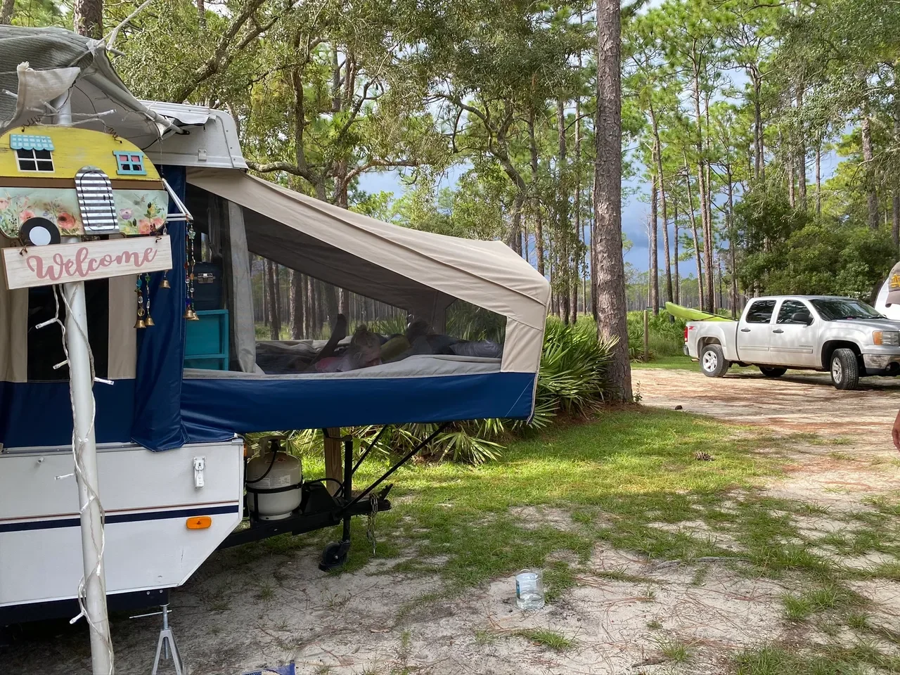 The campground is in a beautiful scrub oak habitat, nestled between a stretch of pine flatwoods and the Ochlockonee River.  It's peaceful and quiet, and the campsites have plenty of room.  Come to think of it... I don't know if I've ever introduced you to our popup, Puddles.  Here she is in all her glory.  And in the background you can see that deeeeep blue foreboding sky, right?  That's why we call her Puddles.  For our whole first year together, rain seemed to follow her everywhere we popped up, at least for some portion of our trip.  But, alas, we ARE in Florida after all.  It's par for the course around here, right?  She's a good girl and she keeps us dry in the rain, cool in the hot, and warm in the cold.  What more can we ask for?