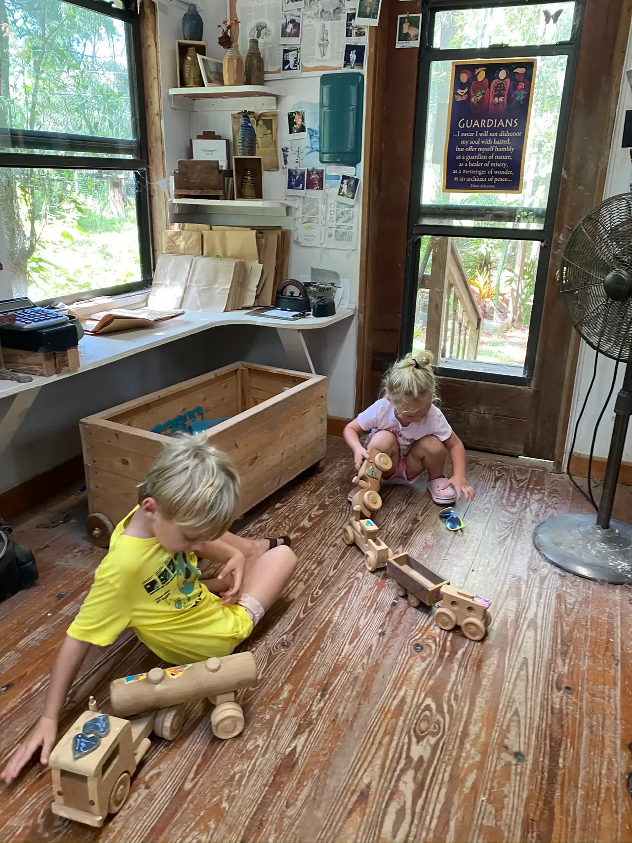 The kids playing with George's handmade wooden toys.
