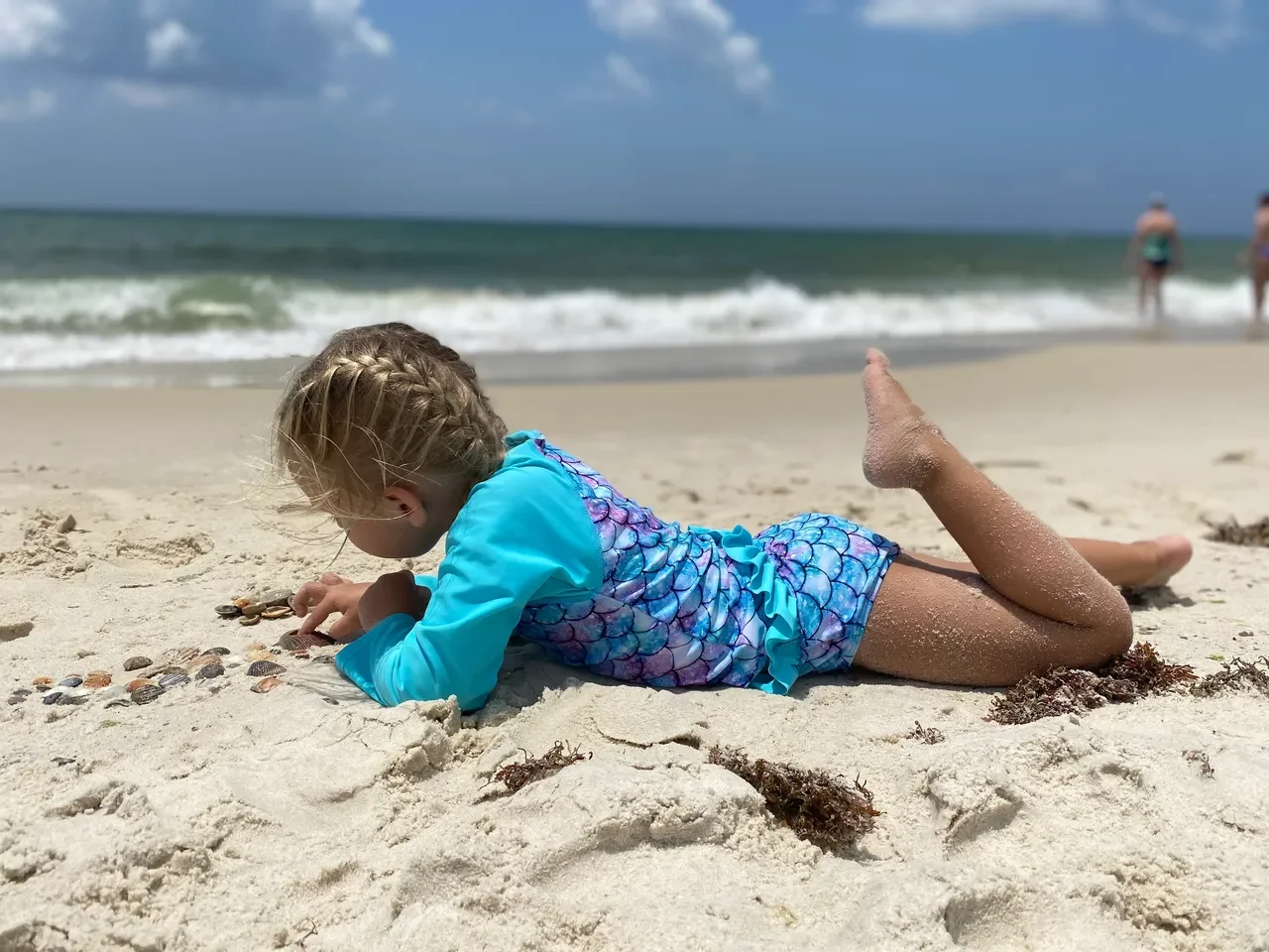 Sweet girl organizing the pretty shells she found while digging through the sand.