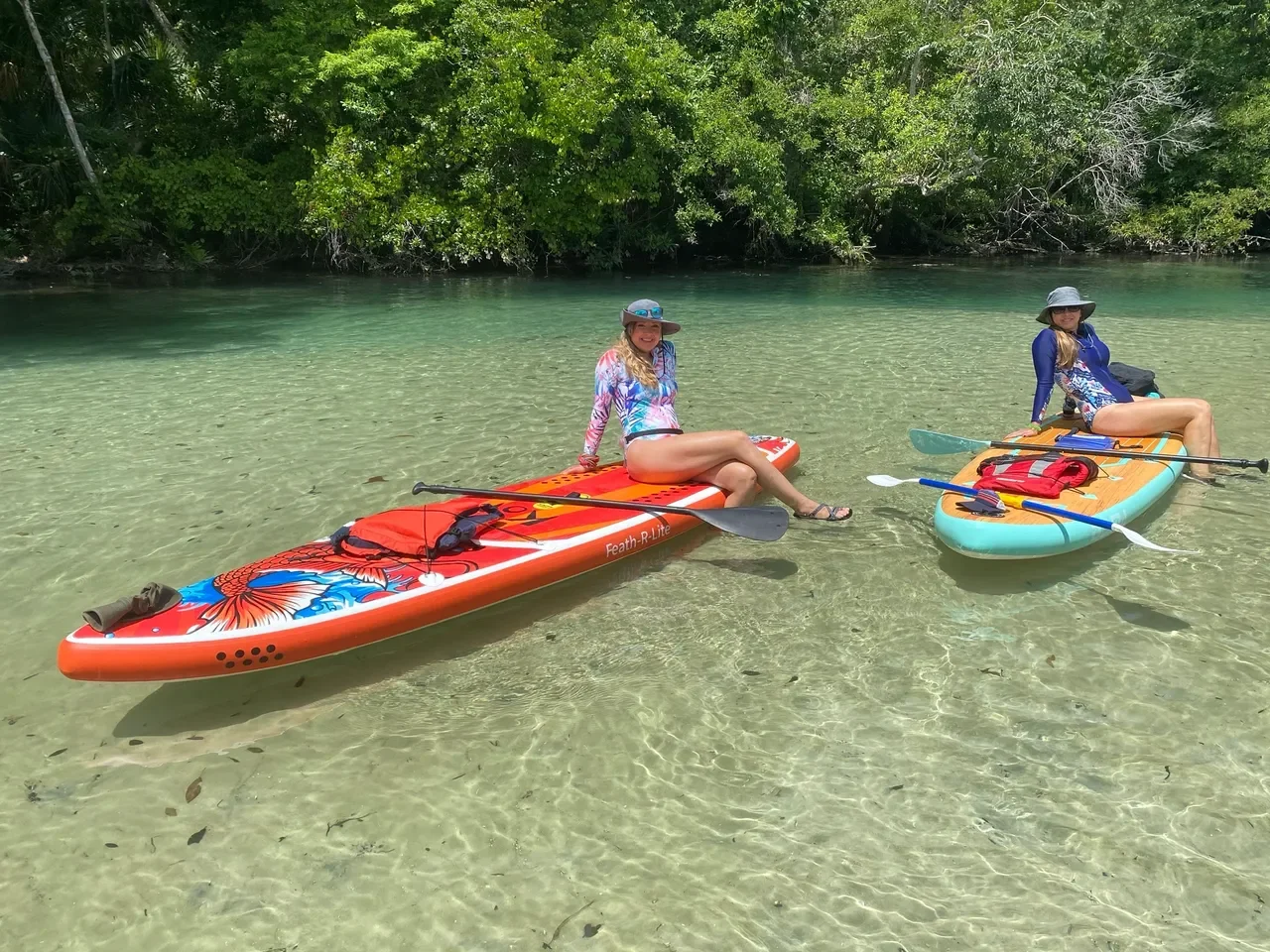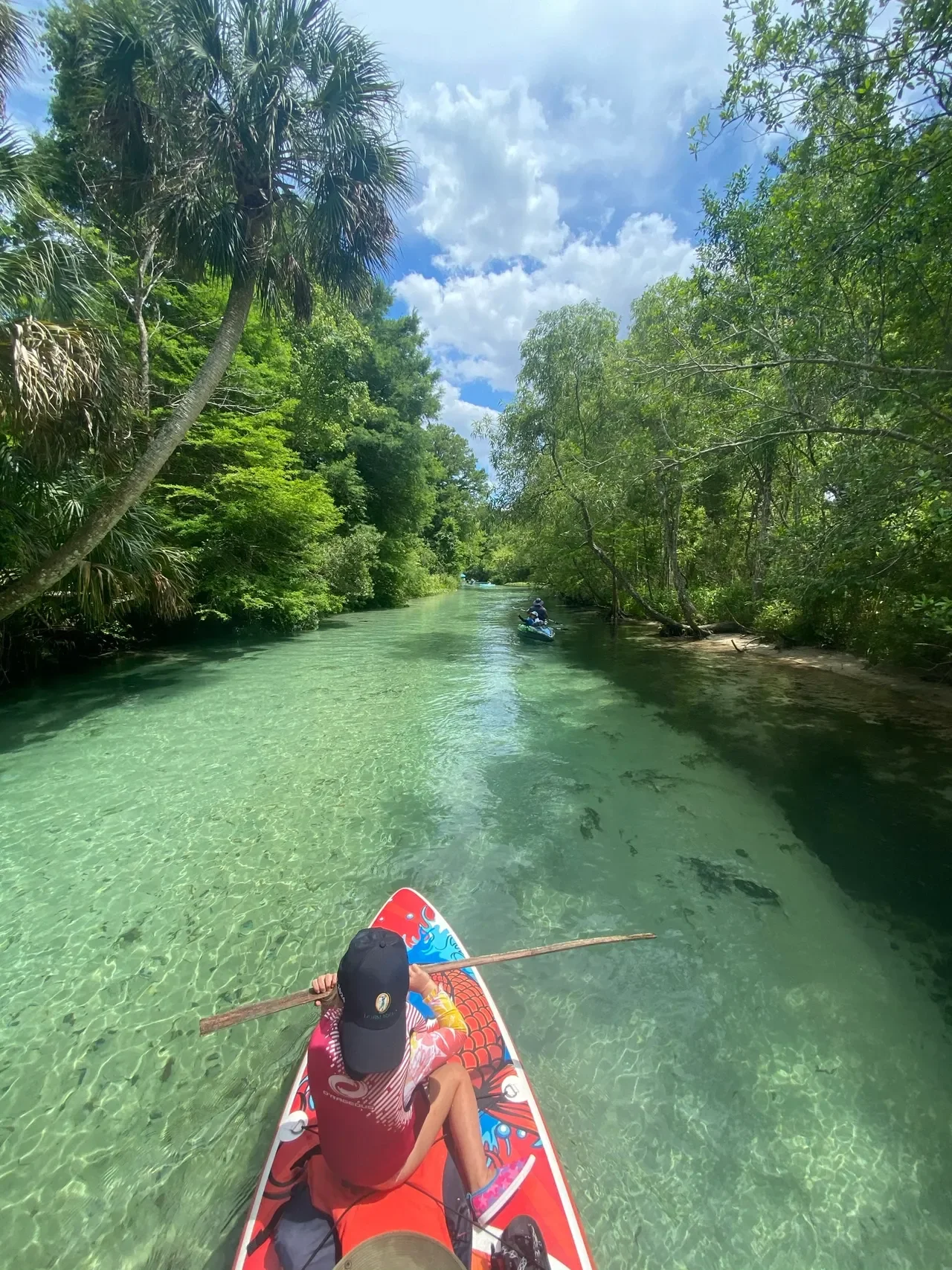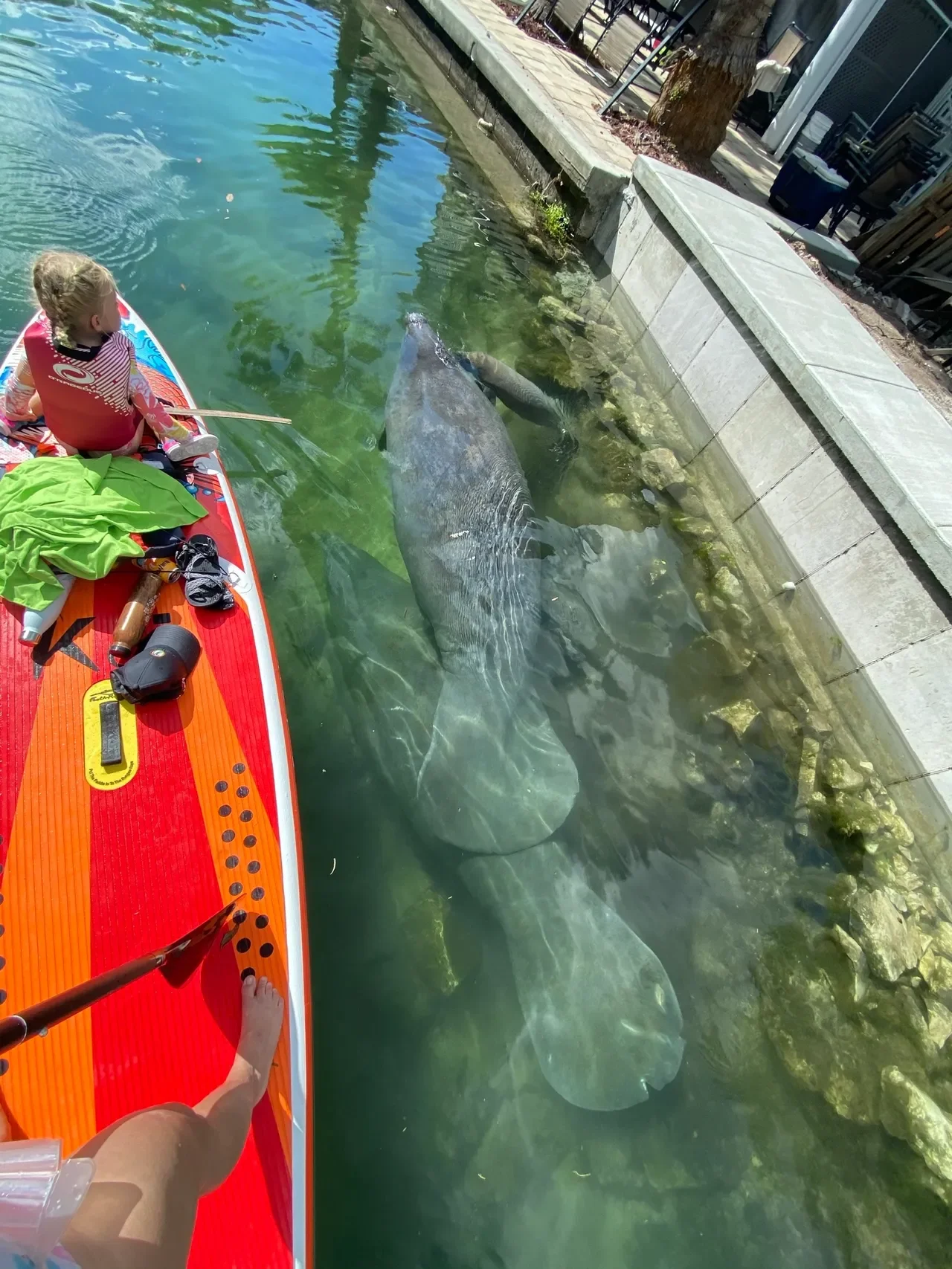 The entire Weeki Wachee River is known as a manatee hotspot, so we were hopeful we'd see a lot during our paddle. We went the majority of our day without seeing any of these gentle giants, but in the very last stretch of our journey, right near Hospital Hole, a popular dive site and manatee hangout near Roger's Park, we suddenly started seeing them one after another! And, be still my heart, we came upon a family with a newborn… it’s the smallest baby manatee I’ve ever seen, ever, and the experience just took our breath away. We stayed relatively still, not wanting to spook the family... But they swam in and around our group, under my SUP and toward the seawall as a little pod.