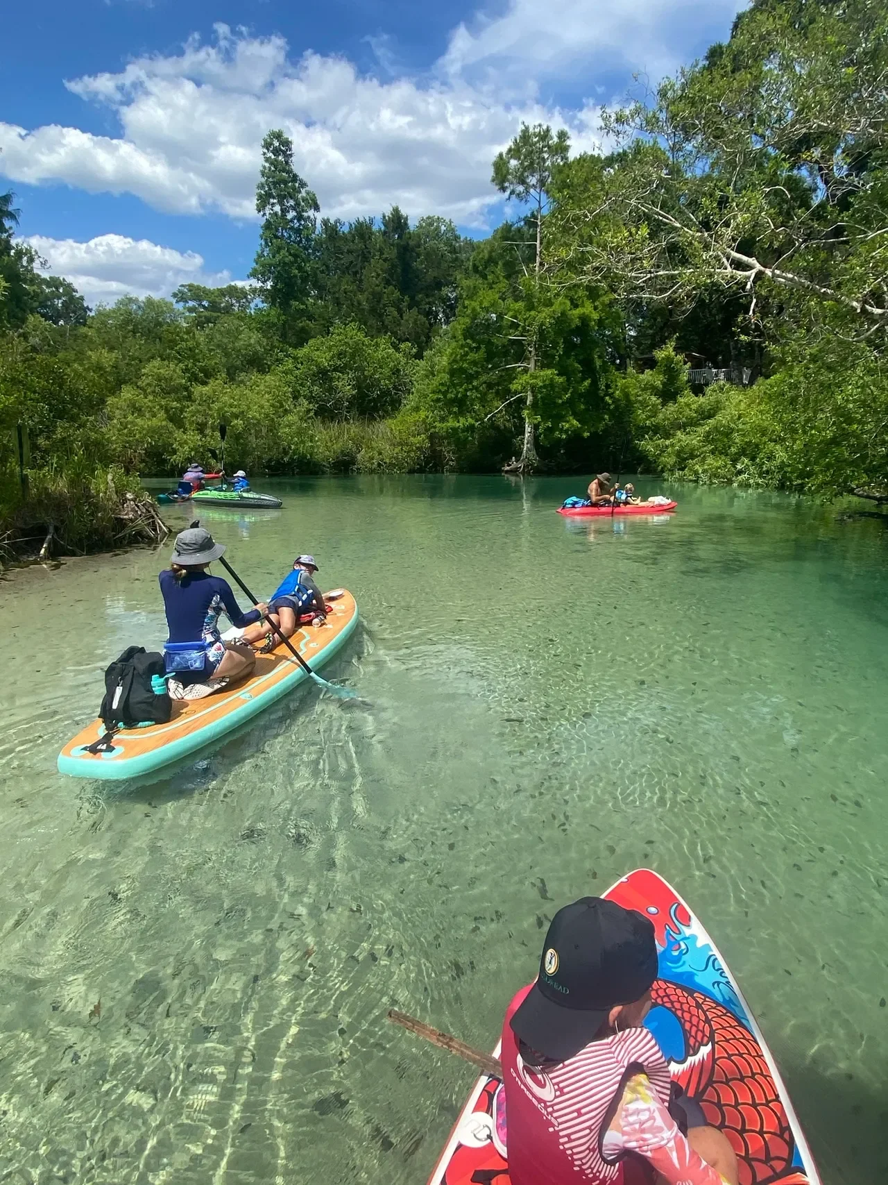 Something to remember: The Weeki Wachee, like many of our beautiful spring runs in Florida, is at risk of being “OVERloved” by visitors who get out of their kayaks, climb on fragile riverbanks, and disturb seagrasses that the manatees depend on for food. So just be mindful of how your time in the river could be impacting it. We stopped for lunch at a sandbar exposed by low tide in the entrance to a man-made canal and let the kids splash around a bit. We also caved and let the kids jump from an established jumping tree (that didn't require walking on a riverbank or disturbing the bottom to get to), into a deep pool on a riverbend, but otherwise we remained on our paddleboards and kayaks for the most part. They key is to find a balance, between enjoying what these incredible places have to offer, and protecting and preserving them for future generations and for and the irreplaceable roles they play in their respective ecosystems.